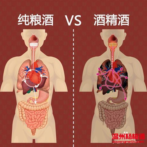 這是網絡上的一張圖,顯示了純糧酒與酒精酒進入人體之后的不同反應……有木有怕怕的?