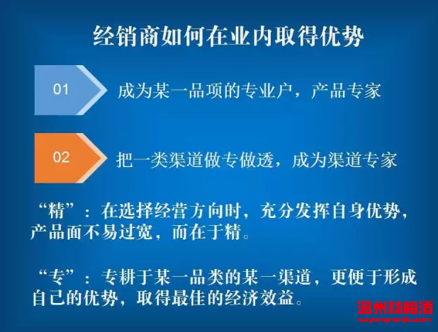 經銷商取得行業內的優勢,基本方式有二:一是成為某一品項的專業戶,產品專家。就如我們平時在市場上常常見到的:飲料大王、名酒經銷商等。這種經營模式為許多經銷商所推從。二是專做某一類渠道。如專做餐飲渠道、專做商超渠道或專做流通渠道。把一類渠道做專做透,形成自己的渠道優勢,成為渠道專家。