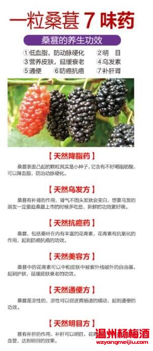 桑椹酒是一種新興的果酒,它是水果酒之中的極品,具有滋補(bǔ)、養(yǎng)身及補(bǔ)血之功效。 飲用后,不但可以改善女性手腳冰冷毛病,更有補(bǔ)血、強(qiáng)身、益肝、補(bǔ)腎、明目等功效。早晚飲用效果更佳。桑椹酒能讓你喝出品味,喝出健康,喝出迷人豐采。