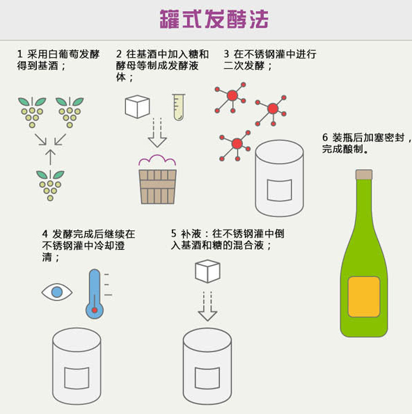 罐式發(fā)酵法最大的優(yōu)點就是成本低,耗時少,節(jié)省勞動力,目前世界上大多價格實惠的起泡酒都采用罐式發(fā)酵法釀制。這種起泡酒一般口感簡單,香氣明顯。不過,由于沒有進(jìn)行酒渣陳釀,少了酵母帶來的復(fù)雜風(fēng)味,因此嘗起來就像靜止葡萄酒中加入了氣泡一樣