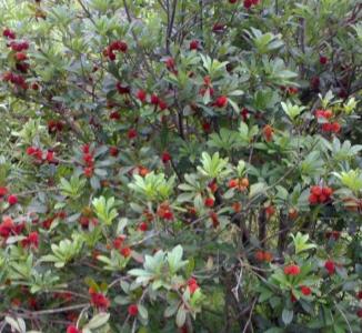 常 綠喬木,高可達12m,樹冠球形。單葉互生;葉片長橢圓或倒披針形,革質(zhì),長8-13cm,上部狹窄,先端稍鈍,基部狹楔形,全緣,或先端有少數(shù)鈍鋸齒, 上面深綠色,有光澤,下面色稍淡,平滑無毛,有金黃色腺體。花雌雄異株;雄花序常數(shù)條叢生于葉腋,圓柱形,長約3cm,黃紅色;雄花具1苞,卵形,先端尖 銳,小苞2-4片,卵形,雄蕊5-6枚;雌花序為卵狀長橢圓形,長約1.5cm,常單生于葉腋;雌花基部有苞及小苞,子房卵形,花柱極短。有2枚細長柱 頭。核果球形,徑約1.8cm,外果皮暗紅色,由多數(shù)囊狀體密生而成,內(nèi)果皮堅硬,徑約9mm,內(nèi)含無胚乳的種子1枚。花期4月。果期6-7月。