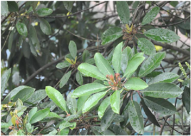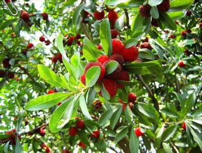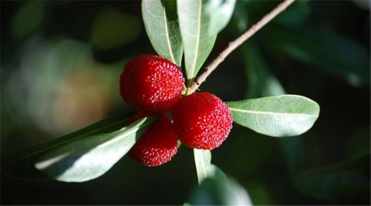 常綠喬木,高可達15米以上,胸徑達60余厘米;樹皮灰色,老時縱向淺裂;樹冠圓球形。小枝及芽無毛,皮孔通常少而不顯著,幼嫩時僅被圓形而盾狀著生的腺體。葉革質,無毛,生存至2年脫落,常密集于小枝上端部分;多生于萌發條上者為長橢圓狀或楔狀披針形,長達16厘米以上,頂端漸尖或急尖,邊緣中部以上具稀疏的銳鋸齒,中部以下常為全緣,基部楔形;生于孕性枝上者為楔狀倒卵形或長橢圓狀倒卵形,長5-14厘米,寬1-4厘米,頂端圓鈍或具短尖至急尖,基部楔形,全緣或偶有在中部以上具少數銳鋸齒,上面深綠色,有光澤,下面淺綠色,無毛,僅被有稀疏的金黃色腺體,干燥后中脈及側脈在上下兩面均顯著,在下面更為隆起;葉柄長2-10毫米?;ù菩郛愔?。雄花序單獨或數條叢生于葉腋,圓柱狀,長1-3厘米,通常不分枝呈單穗狀,稀在基部有不顯著的極短分枝現象,基部的苞片不孕,孕性苞片近圓形,全緣,背面無毛,僅被有腺體,長約1毫米,每苞片腋內生1雄花。雄花具2-4枚卵形小苞片及4-6枚雄蕊;花藥橢圓形,暗紅色,無毛。雌花序常單生于葉腋,較雄花序短而細瘦,長5-15毫米,苞片和雄花的苞片相似,密接而成覆瓦狀排列,每苞片腋內生1雌花。雌花通常具4枚卵形小苞片;子房卵形,極小,無毛,頂端極短的花柱及2鮮紅色的細長的柱頭,其內側為具乳頭狀凸起的柱頭面。每一雌花序僅上端1(稀2)雌花能發育成果實。核果球狀,外表面具乳頭狀凸起,徑1-1.5厘米,栽培品種可達3厘米左右,外果皮肉質,多汁液及樹脂,味酸甜,成熟時深紅色或紫紅色;核常為闊橢圓形或圓卵形,略成壓扁狀,長1-1.5厘米,寬1-1.2厘米,內果皮極硬,木質。4月開花,6-7月果實成熟。